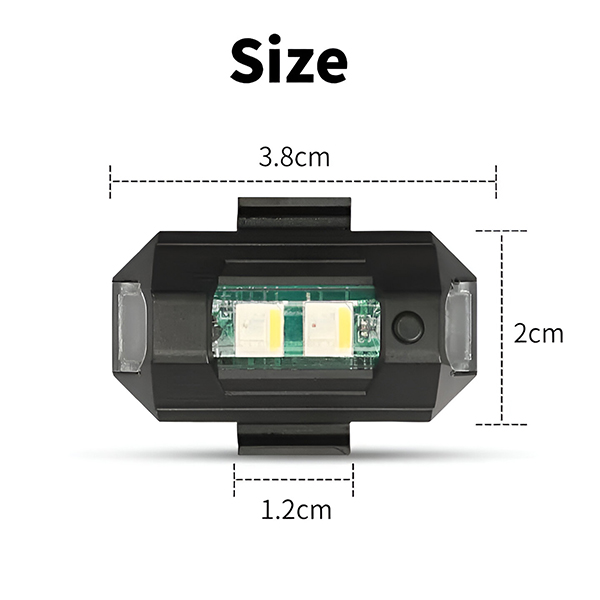 📏 Compacto y ligero – 3,8 x 2 cm, carcasa de ABS, juego de 2 luces con almohadillas de velcro, anillos de goma y cable de carga USB incluidos.