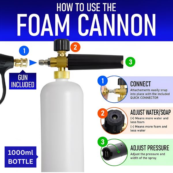Llena la botella con jabón y agua tibia, conecta el enchufe de conexión rápida a la pistola de lavado y ajusta la perilla superior al nivel de espuma que quieras.